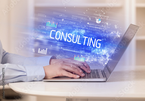 Closeup of businessman hands working on laptop with CONSULTING inscription, succesfull business concept