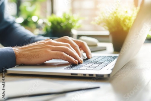 Closeup of businesswoman typing on laptop computer, surfing the internet, using mobile phone while working at home, digital tablet on office table