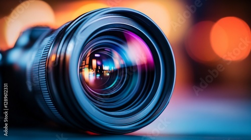 Close-up of camera lens with bokeh background.