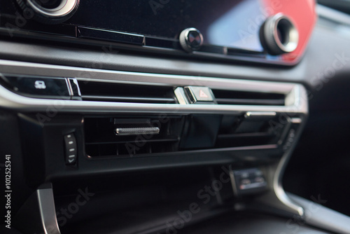Closeup of car dashboard air vents near gear shift