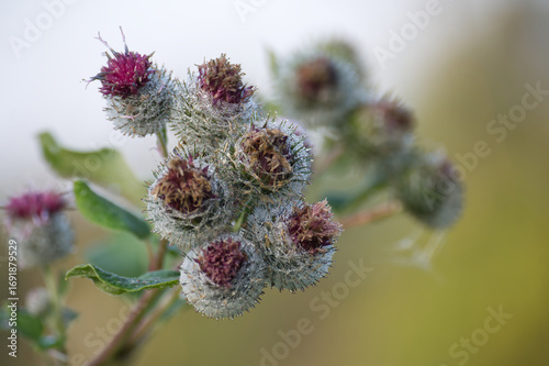 Close-up of Carduus crispus covered in dew.