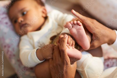 Close-up of careful black mother holding feet of baby in hands and enjoying time together, maternity concept
