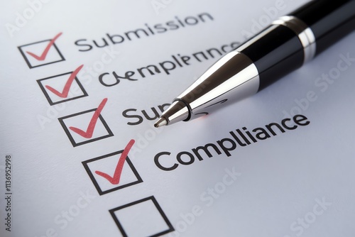 Close-up of checklist with red checkmarks and pen indicating compliance and completion.