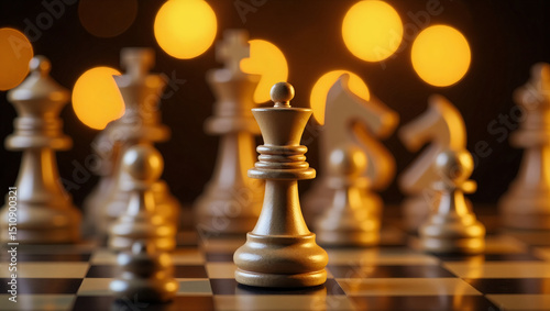 Close-up of chessboard with king piece in dramatic lighting. Strategy game concept, leadership, competition mindset, decision making, classic board game scene, intelligence symbol, focus, planning