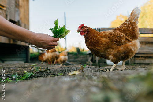 Close-up of chickens eating greens from a human hand. Brown hens close up on free range outside, Rural scene, organic farmer feeding chickens grass A look at organic farming: feeding chickens.