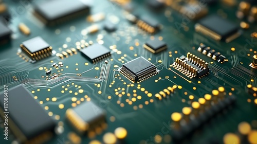 Close-up of circuit board, technology components, intricate design, background blur, for tech articles.
