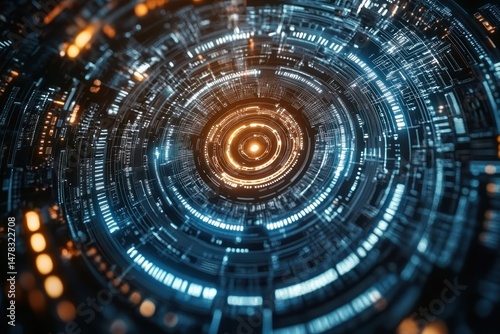 Close-up of circular futuristic digital interface with glowing blue and orange lights and complex circuit-like patterns conveying technology and innovation