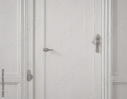 Close-up of closed white wooden door; subtle handle detail , fresh, white door, sleek