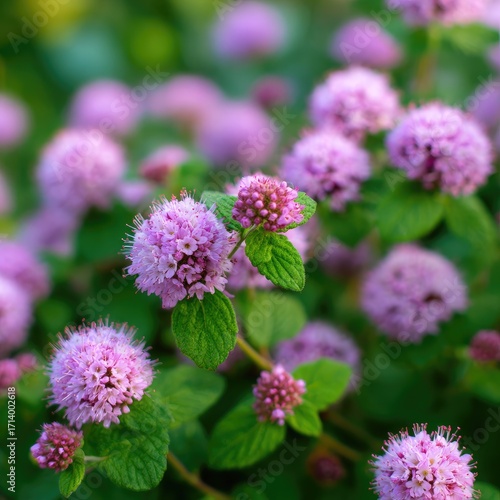 Close-up of clusters of small, vibrant purple flowers, set against a backdrop of lush green foliage. Soft focus accentuates the delicate blooms