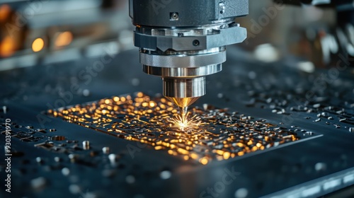 Close-up of CNC machine cutting intricate patterns into a metal sheet, emphasizing the detail and precision in manufacturing.