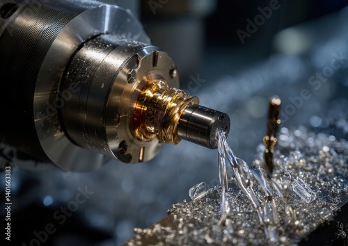Close-up of CNC machine cutting metal with precision and cooling fluid.