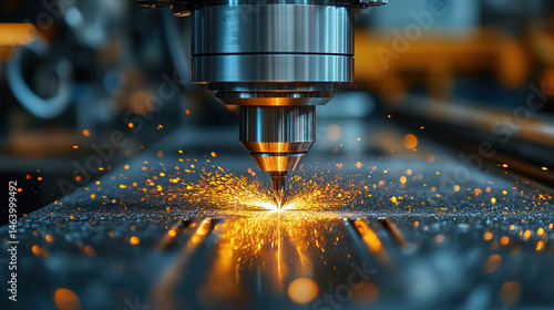 close-up of CNC milling machine cutting a metal surface, showing precision and sparks