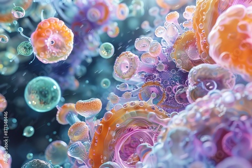 Close-up of colorful microscopic cells, showcasing intricate patterns and vibrant hues in a scientific and life science concept.