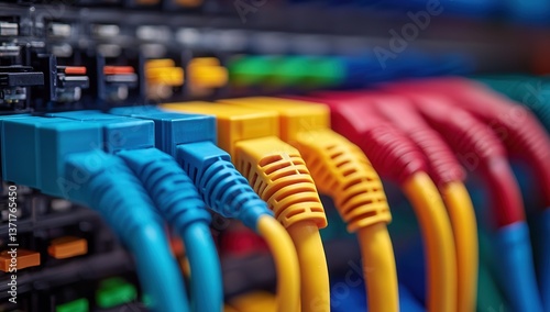 Close-up of colorful network cables plugged into a server in a data center, conveying high-tech communication themes.