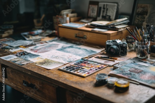 closeup of colorful paint palette with brushes and retro camera on wooden table, concept of remote creative business and home office art projects