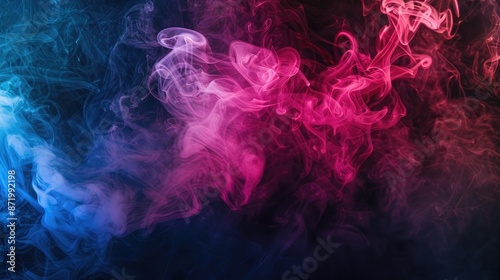 Close-up of colorful pink and blue smoke blending artistically on a black surface, ideal for backgrounds or artistic concepts
