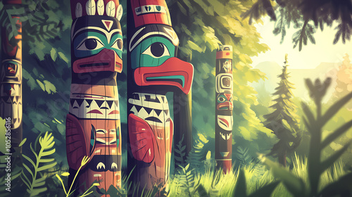 Close-up of colorful totem pole in a serene, sunlit forest. Native American Totem Poles. Illustration