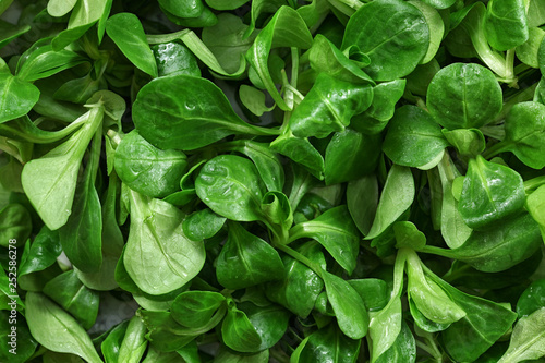 Closeup of common cornsalad ( Valerianella locusta ) wet from water, healthy green leaves food background.