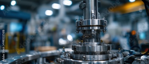 Closeup of complex shiny metal machinery in a factory setting, showcasing precision engineering and industrial technology