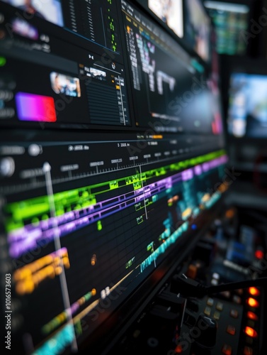 Close-up of computer monitor displaying vibrant colors, patterns. Green, purple, orange hues dominate screen. Modern technology equipment in pro video editing studio setup. Computer monitor with