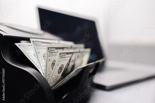 Close-up of counting 100 dollar bills on a financial professional's desk next to a laptop computer in a counting machine. Concept of banks, loans, deposits or currency exchange and stocks.