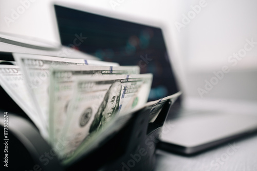 Close-up of counting 100 dollar bills on a financial professional's desk next to a laptop computer in a counting machine. Concept of banks, loans, deposits or currency exchange and stocks.