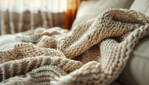Close-Up of Cozy Knitted Sweater on Soft Beige Sofa, Warm and Comfortable Fabric, Relaxed Day at Home, Quiet Luxury