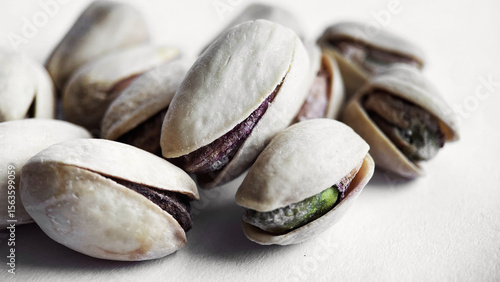Close-up of Cracked Pistachios Revealing Texture and Color on a Light Background