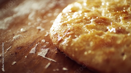 Close-up of crispy ciabatta bread revealing bubbles and cracks on a natural wood surface