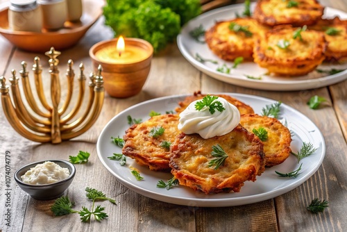 Close-Up of Crispy Golden Hanukkah Latkes on a Minimalist White Plate with Sour Cream and Applesauce Garnish for Festive Culinary Delight