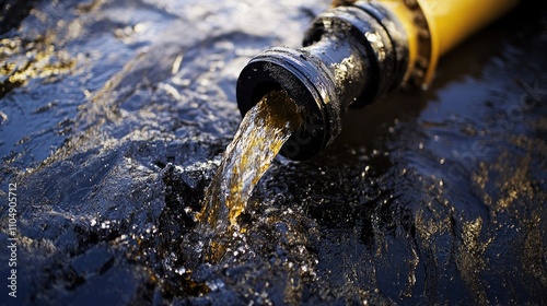 Close-up of crude oil gushing from a pipe, highlighting the oil extraction process from the ground in an industrial setting