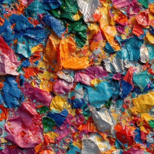 Close-up of crumbled colorful plastic pieces, a textured and vibrant abstract mosaic