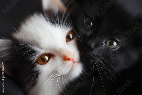 Closeup of cute black and white kittens cuddling together