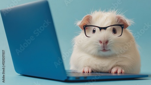 Close-up of cute guinea pig with glasses working on a blue laptop against pastel blue background