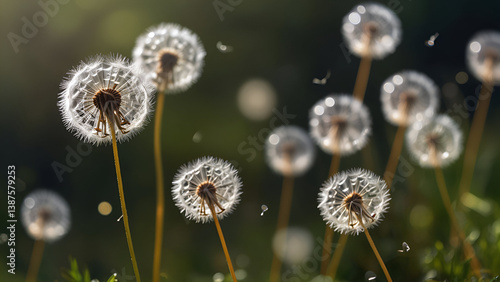 Close-up of dandelion seed heads dispersing seeds in the wind against a blurred natural background illustrating plant reproduction