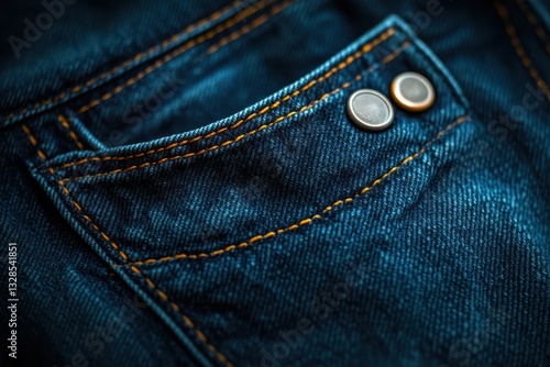 Close-up of dark blue jeans pocket, showing stitching and buttons. Ideal for fashion, textile, and denim-related projects.