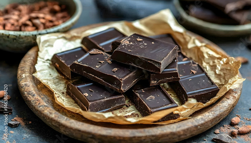 Close-up of Dark Chocolate Squares on a Wooden Plate
