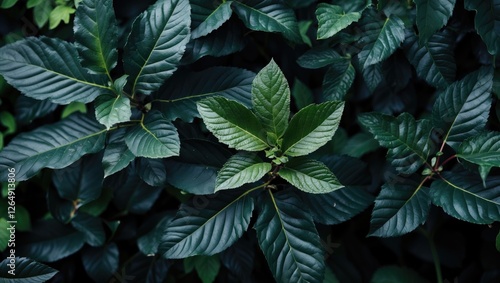 Close-up of dark green leaves with various textures and shades arranged in natural pattern with copy space