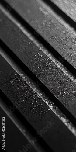 Close-up of dark, wet, parallel grooved surface.