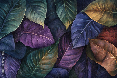Close-up of dark-toned leaves with textured surface, showing deep purple, teal, and bronze hues, creating rich and lush appearance symbolizing nature's beauty and tranquility, perfect for design backg