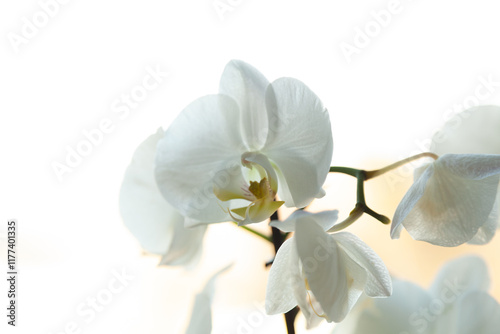 Close-up of delicate white orchids, softly lit against a bright background. Perfect for serenity and spa themes.