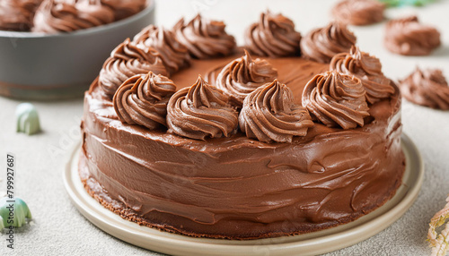 Close-up of delicious cake with brown buttercream, whipped cream frosting. Tasty dessert. Sweet food