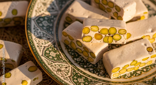 Close-up of delicious pistachio nougat candies served on a decorative plate