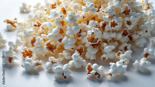 Close-up of delicious popcorn border, isolated on white background.