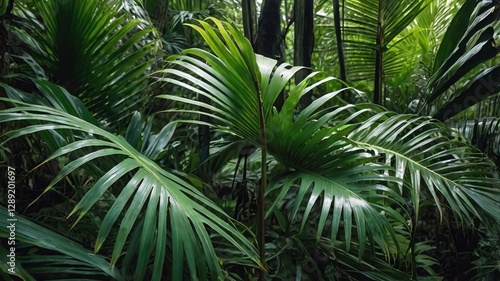 Close-up of dense, green tropical leaves resembling palm fronds, captured in an Asian forest.