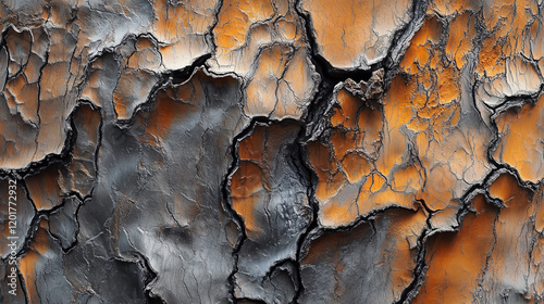 Close-up of detailed tree bark, showing deep cracks, crevices, and a mix of light brownish-orange and dark grayish-silver tones