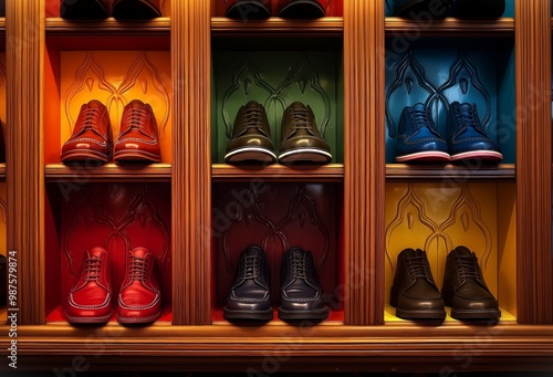 Close-up of different men's shoes on a shelf, colored background panels. soft light, atmosphere of elegance and quality