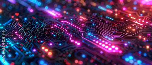 Closeup of digital pathways glowing in different colors on a circuit board