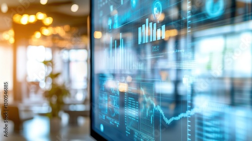 Close-up of digital screen showing labor market graph with job openings and employment rates, office setting with copy space for text overlay.