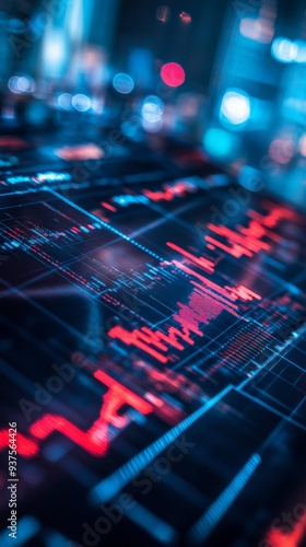 Close-up of digital stock market graph showing trends and fluctuations in red, set against a modern background of financial data and charts.